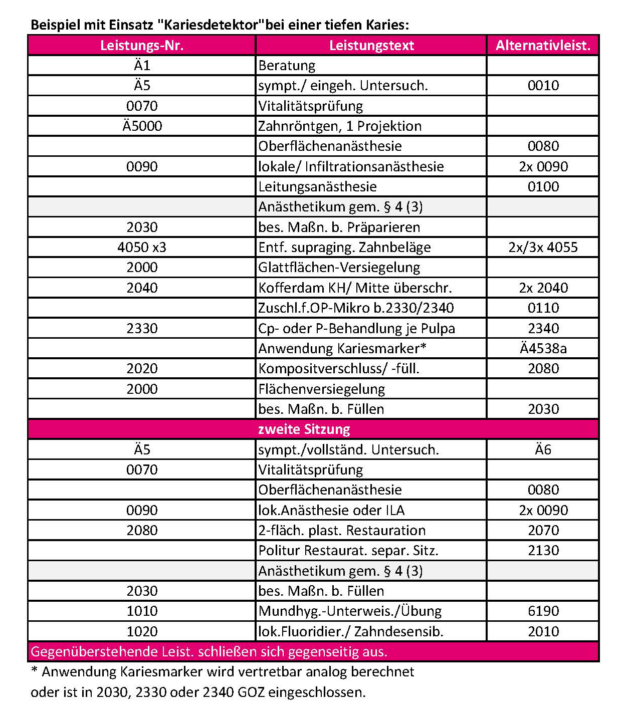 „Chemische Kariesdetektoren“ und „Kariesrelevatoren“ sind markierungsfähige, u. A. Karies affine und haftende Farbstoffanwendungen zur klinischen Inspektion, die entweder mit erhöhtem Steigerungssatz bei tatsächlich anfallender Sichtkontrolle der klinischen Kariesexkavation nach den Nrn. 2330 bzw. 2340 GOZ abgegolten sind oder in einem Fall ohne Pulpabehandlung als „besondere Maßnahme beim Präparieren“ nach Nr. 2030 GOZ einmal je Kieferhälfte oder Frontzahnbereich berechnungsfähig sind.